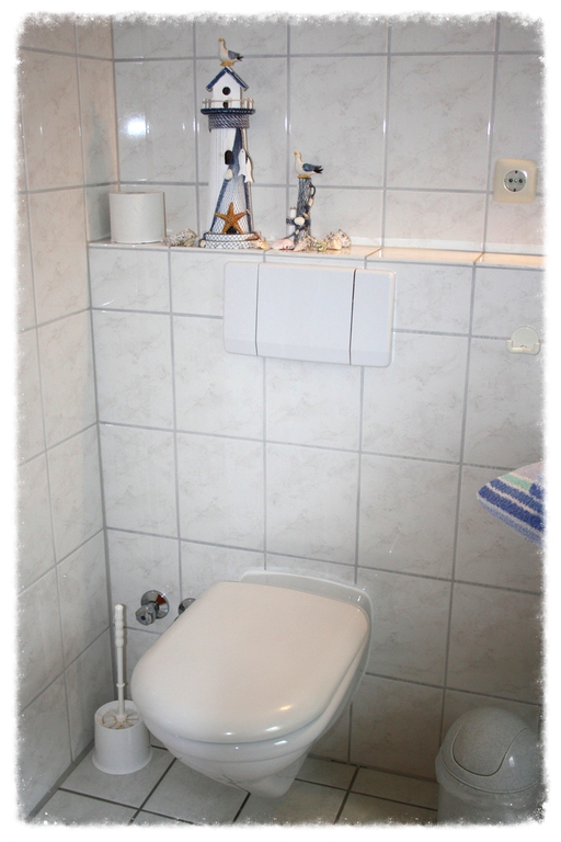 Das Tageslichtbad mit Waschbecken, Dusche, WC ist geräumig. Dort befindet sich auch eine Waschmaschine (Nutzungsgebühr € 5,- pro Waschgang).