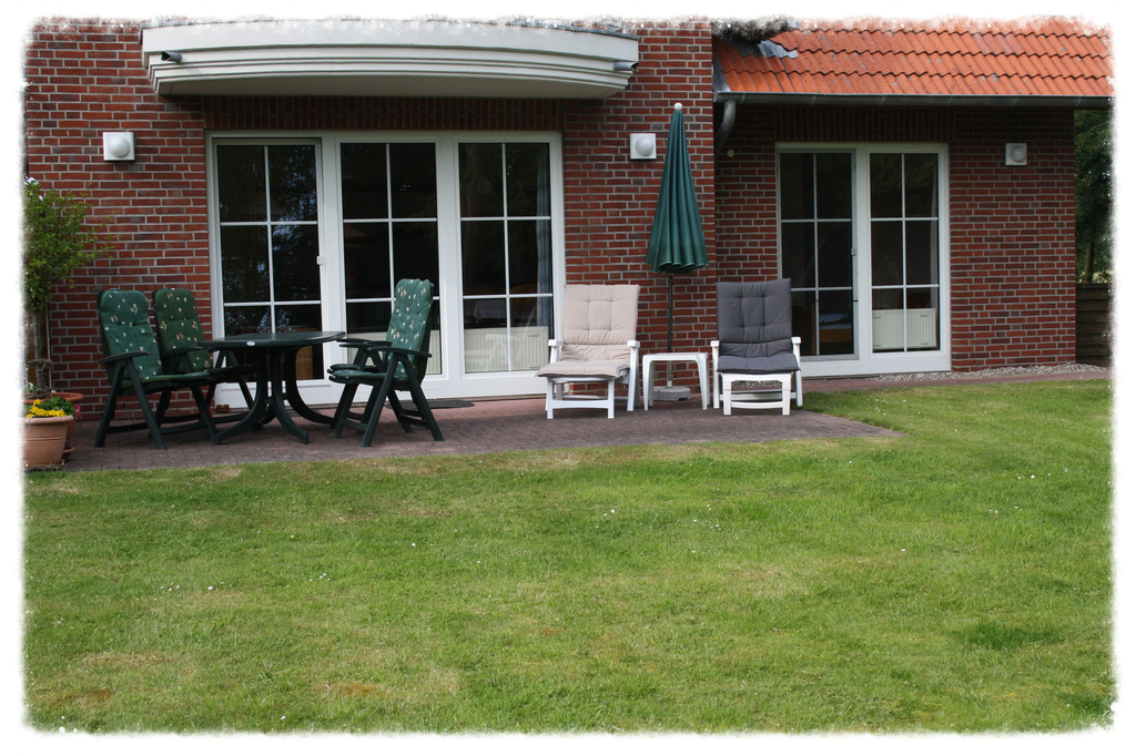 Eine große Terrasse, mit bequemen Gartenmöbeln, und der wunderschöne Garten laden zum Verweilen und Entspannen ein.